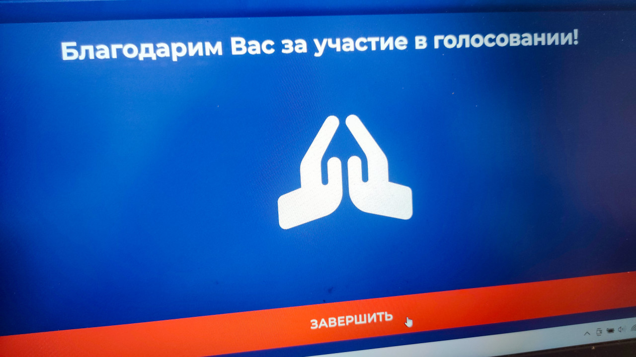 На снимке представлен экран ноутбука с отображением заключительного сообщения системы электронного предварительного голосования: крупный текст благодарности и пиктограмма, символизирующая завершение процесса. В нижней части — красная кнопка «ЗАВЕРШИТЬ». Кадр снят под небольшим углом, что позволяет видеть часть корпуса устройства. Фотография может использоваться в материалах о цифровых избирательных технологиях, электронных сервисах и развитии онлайн-голосования.