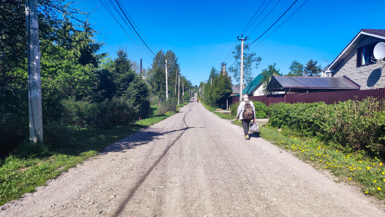 На снимке показан длинный участок грунтовой улицы, проходящей через частный сектор. По правой стороне идёт пешеход, несущий сумку. Вдоль дороги стоят жилые дома, заборы и хозяйственные постройки. Слева видны плотные зелёные насаждения, включающие хвойные деревья и кустарники. Дорожное покрытие утрамбованное, местами с включением мелкого камня. Линии электропередачи проходят по обеим сторонам улицы, опираясь на бетонные и деревянные опоры. Съёмка может быть использована в материалах о сельской инфраструктуре, быте и транспортной доступности малых населённых пунктов.