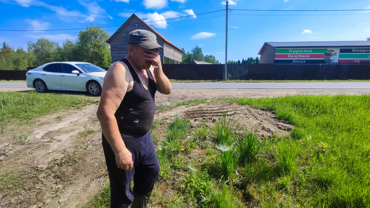 На фотографии запечатлен мужчина в темной майке и кепке, стоящий на придорожном участке с грунтовой полосой и травой. Он придерживает лицо рукой, а рядом видны следы на земле, возможно, от колес. На заднем плане находятся белый легковой автомобиль, деревянное здание под металлической крышей и рекламная вывеска на строении. Фоном служит загородная дорога с электрическими проводами и забором. Снимок может быть использован в материалах о сельской местности, дорожных ситуациях и повседневной жизни.