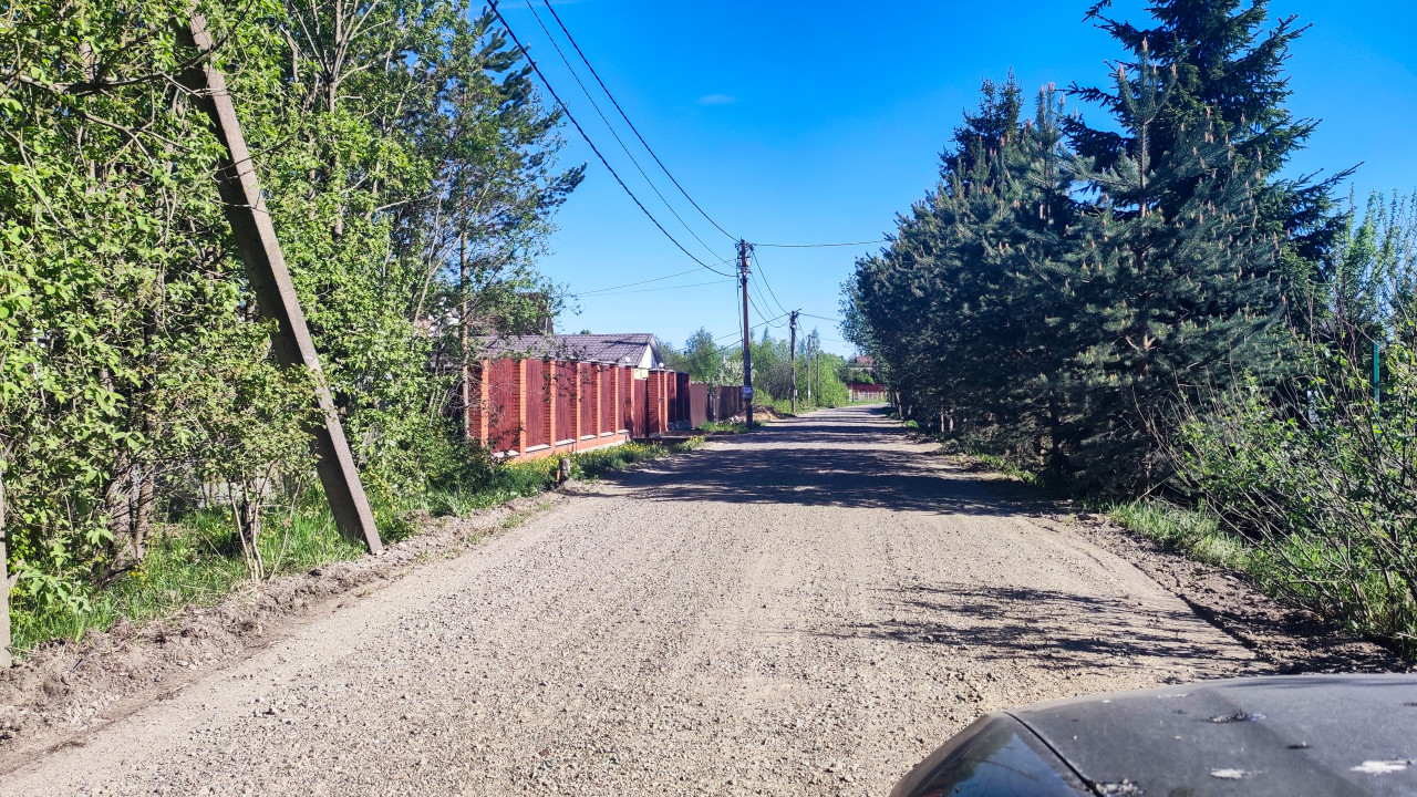 На фотографии представлена спокойная грунтовая улица частного сектора, идущая вдоль деревянных и металлических заборов. По обе стороны дороги растут зрелые деревья, включая ели и листовые породы. Над улицей проходят линии электропередачи, закрепленные на деревянных и бетонных опорах. Снимок передает структуру пригородной застройки и может использоваться в материалах о небольших поселениях, транспортной доступности, инфраструктуре и сезонных изменениях в сельских районах.