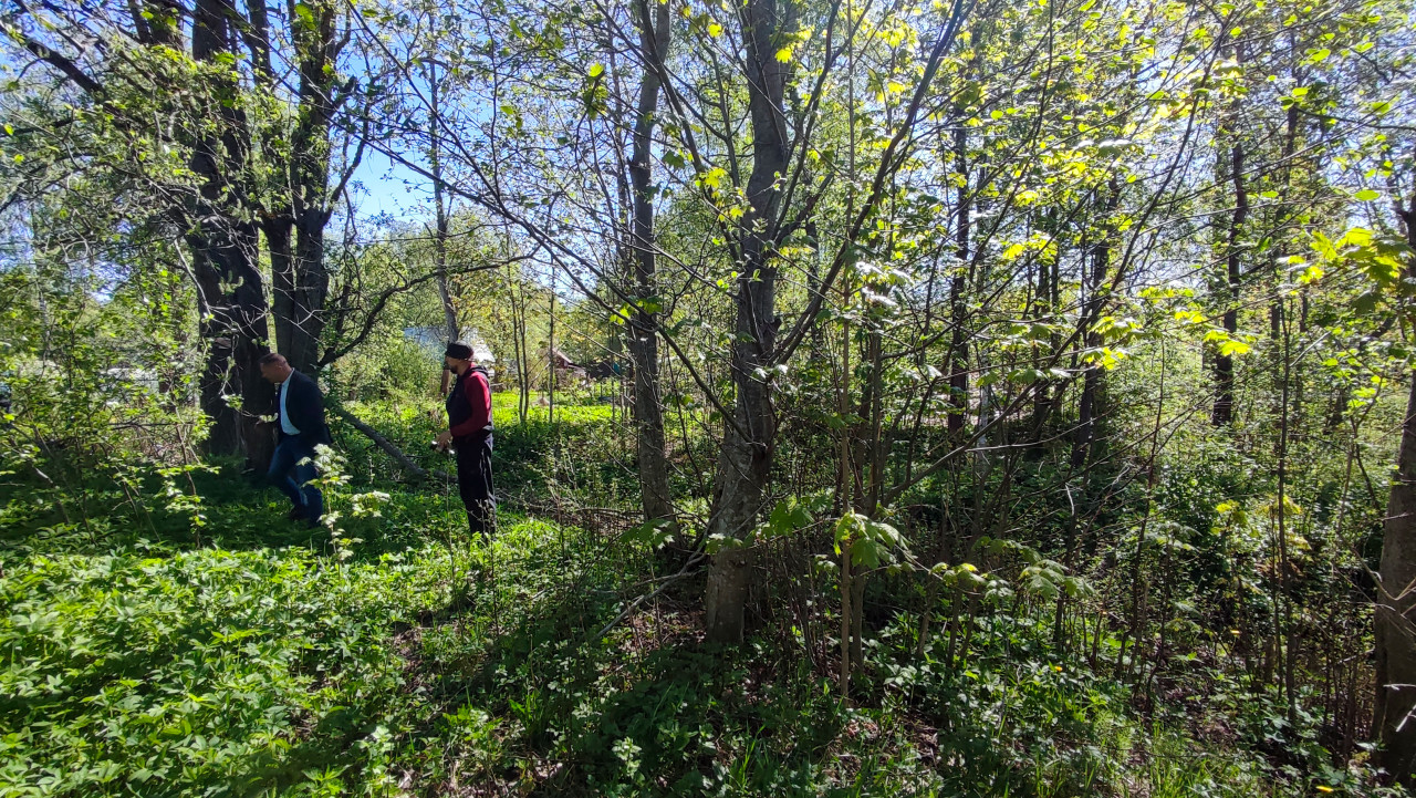 На снимке два человека находятся на участке лесной растительности, окружённом молодыми побегами и высокими стволами лиственных деревьев. Один из них стоит ближе к большому дереву, другой расположен рядом, оба визуально осматривают территорию или обсуждают состояние участка. На фоне просматривается плотная зелёная растительность и солнечные блики на листьях. Фотографию можно использовать для материалов о выездных осмотрах, экологических обследованиях, изучении природных территорий, сезонных работах и локальных лесных массивах.