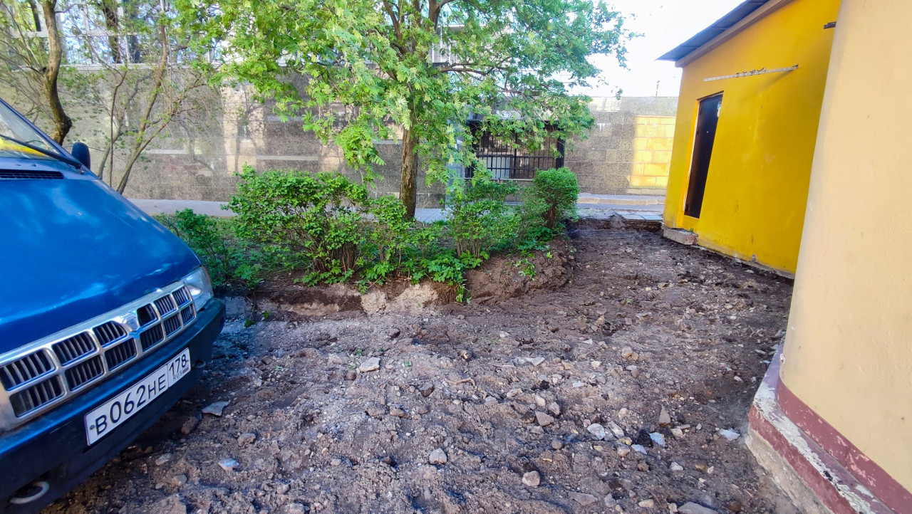 На фотографии изображён участок двора с кустарниками и деревом, расположенными рядом с хозяйственным строением с ярко-жёлтой стеной. В левой части кадра заметна передняя часть синего фургона, а на земле виден рыхлый грунт и следы демонтажа покрытия. В глубине двора располагается металлическая ограда и фасад соседнего здания. Сцена снята днём при ярком солнечном свете. Изображение можно использовать в материалах о благоустройстве, состоянии дворовых территорий и текущих земляных работах.