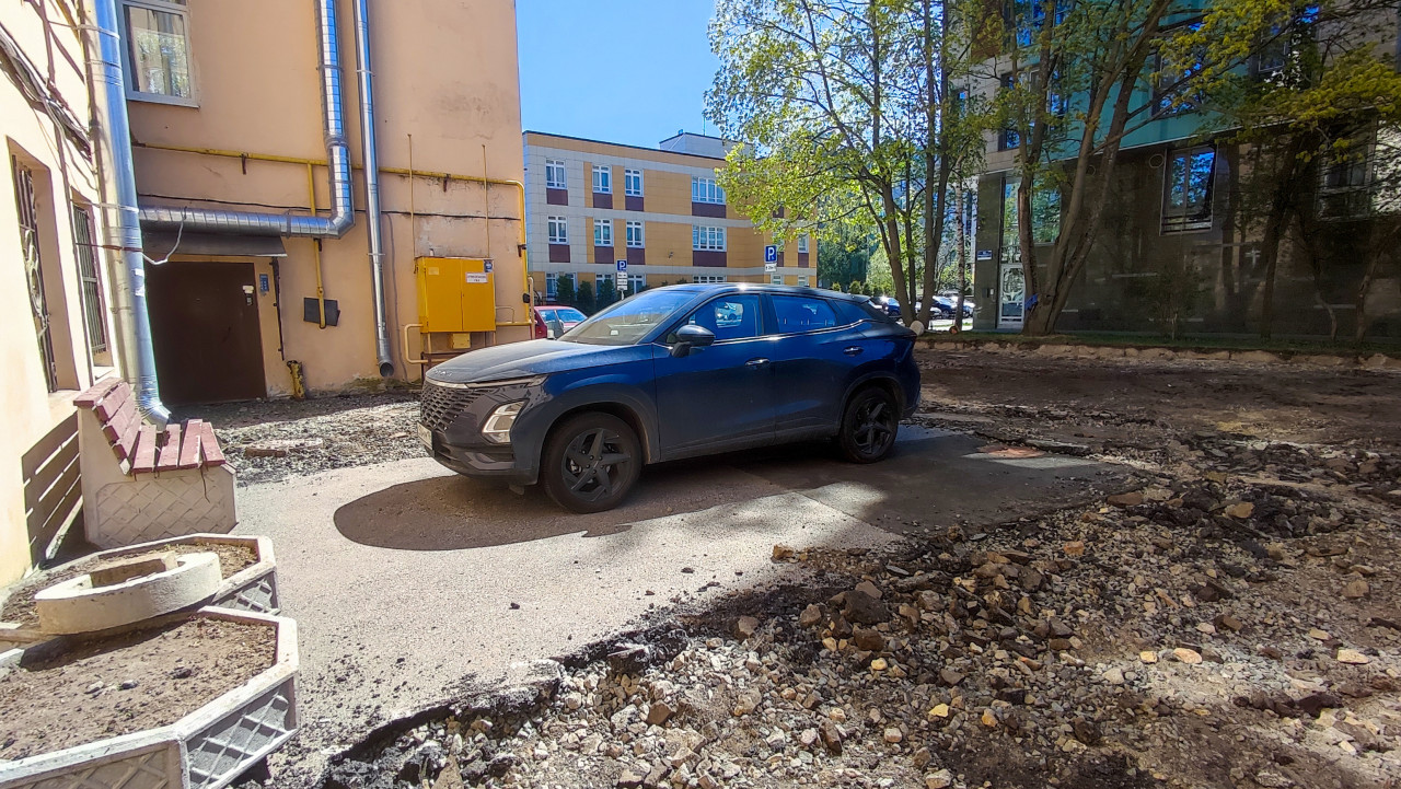 На изображении находится автомобиль, припаркованный рядом с подъездом жилого дома, окружённый участками рыхлого грунта и следами демонтажа дорожного покрытия. Видны металлические трубы инженерных коммуникаций, жёлтый газовый шкаф и окна с решётками. На заднем плане разместилось современное здание с панорамным остеклением и парковочными знаками. Снимок сделан днём при солнечном освещении. Фотография может быть использована в публикациях о ремонте дворов, городской инфраструктуре и инженерных системах придомовых территорий.
