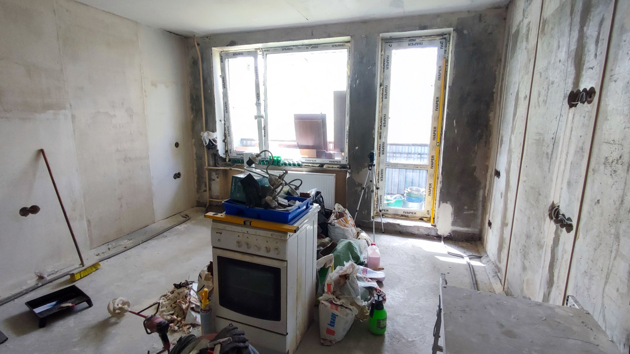 На фотографии изображена просторная комната, находящаяся в процессе ремонта. Стены частично выравнены, на них видны следы шпаклёвки и снятых покрытий. По центру стоит старая плита, на которой размещены строительные принадлежности и инструменты. На полу расположены мешки со смесями, пластик, бытовые ёмкости и другие материалы. Справа видна зона монтажа электропроводки с несколькими каналами в стене. Окна установлены недавно, на рамах сохранились защитные ленты производителя. Кадр подходит для тем о ремонте, реконструкции помещений, подготовке пространства и организации строительных процессов.