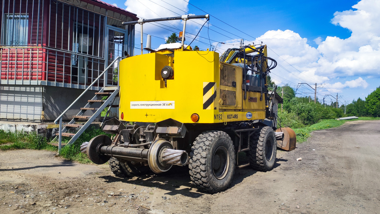 На фотографии показан экскаватор-погрузчик GEISMAR KGT-4RS на комбинированном ходу, предназначенный для выполнения работ на железнодорожных путях. Машина жёлтого цвета, стоящая рядом со зданием поста, оснащена гидравлическим манипулятором, рельсовыми адаптерами, топливным блоком и сервисными контейнерами. Различимы маркировки модели и номер N182. На заднем плане видны опоры контактной сети, железнодорожные рельсы, зелёные насаждения и элементы служебной инфраструктуры. Съёмка проведена в ясную погоду днём. Фотография может использоваться в материалах о техническом обслуживании железных дорог, работе специализированной техники и демонстрации оборудования для путевых работ.