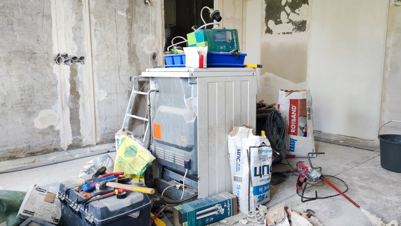 На фотографии показано помещение с черновой отделкой, где стены находятся в стадии выравнивания и подготовки под последующие работы. В центре размещена бытовая техника, используемая как импровизированный рабочий стол, на котором стоят контейнеры с инструментами и расходными материалами. По полу расставлены мешки со строительными смесями, наборы инструментов, коробки и электродрель с удлинителем. Видны частично проложенные коммуникации и следы демонтажа старых покрытий. Кадр подходит для материалов о ремонте, строительных услугах, черновой отделке и организации рабочего пространства.