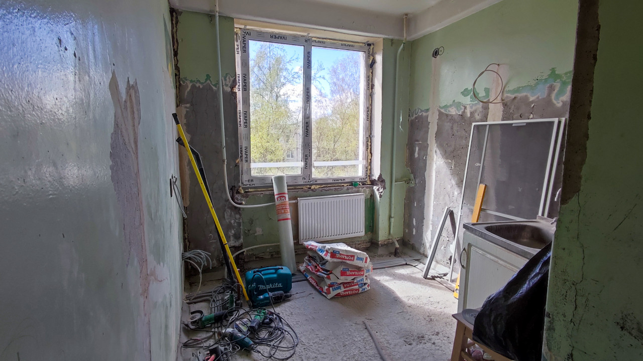 На снимке показано помещение, находящееся в стадии капитального ремонта. На стенах видны следы снятой штукатурки, оголённые участки и подготовленные поверхности. Под окном установлен новый радиатор отопления, а само окно частично закрыто защитной плёнкой производителя. На полу лежат строительные материалы, мешки с сухими смесями, инструменты, включая дрель и шлифовальную машину. Справа стоит старая раковина, а рядом опирается оконная рама. В кадре присутствуют следы электрической проводки и мусор строительного этапа. Фотография подходит для иллюстрации тем о ремонте, строительстве, подготовке помещений и инженерных работах.