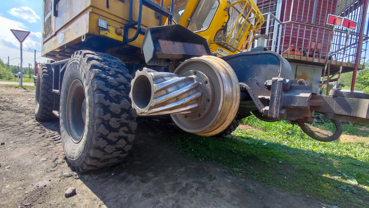 На снимке представлен фрагмент переднего узла экскаватора GEISMAR KGT-4RS, включающий рельсовый адаптер для передвижения машины по рельсам. В центре кадра виден адаптер цилиндрической формы с продольными гранями, а также часть рамы, узлы крепления и элементы гидравлической системы. Слева располагается крупная колесная база, справа заметны служебные конструкции на металлических опорах и участок травы. Освещение солнечное, подчёркивающее фактуру металла. Фото может использоваться в технических статьях, учебных материалах и документации по обслуживанию путевых машин.