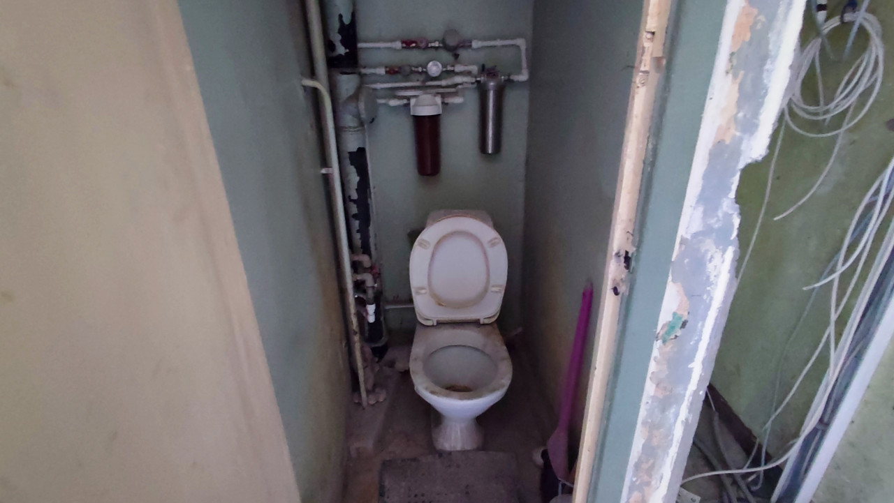 На фотографии изображён узкий санузел со старым унитазом и открытыми трубами водоснабжения и фильтрации. Видны элементы инженерных систем, включая фильтры грубой и тонкой очистки, а также разводка труб вдоль стены. Поверхности помещения имеют следы старых покрытий и износа, демонтажные участки и обнажённую инфраструктуру. Кадр подходит для материалов о ремонте в старых домах, замене инженерных систем, модернизации коммуникаций и подготовке помещений под обновление.