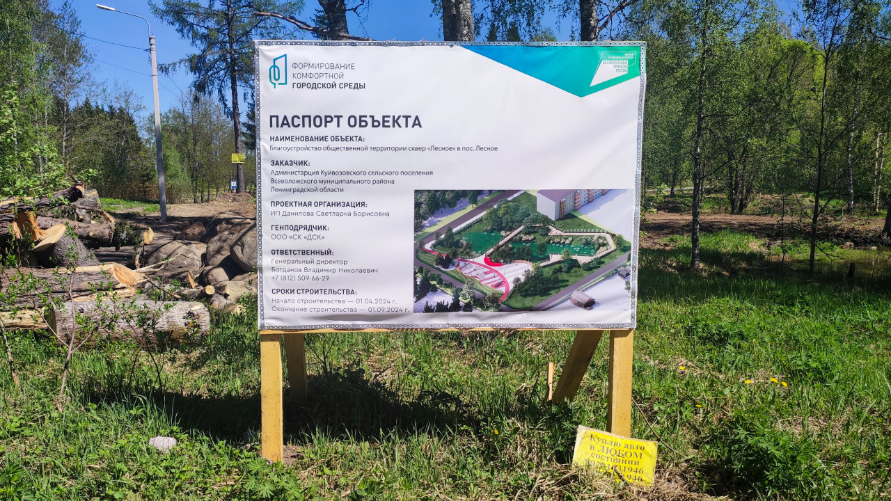 На фото размещён информационный щит «Паспорт объекта» на фоне вырубленной территории, где проводится благоустройство сквера «Лесное» в посёлке Лесное Ленинградской области. На щите указаны заказчик, проектная организация, подрядчик, сроки строительства и схема будущего объекта. Вокруг видны срезанные деревья, участки земли и лесопосадка. Снимок отражает начальный этап работ по формированию общественного пространства. Фотография может быть использована в материалах о градостроительстве, благоустройстве, работе муниципальных служб и документировании строительства.