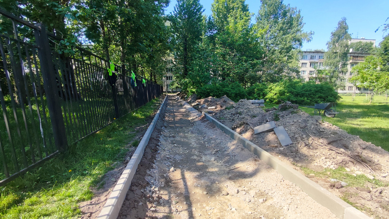 На фотографии показан участок строительства пешеходной дорожки в зелёной дворовой зоне. Вдоль длинной траншеи уже уложены новые бордюрные камни, а основание дорожки подготовлено и выровнено. Справа расположены насыпи грунта, строительные материалы и тачка. Слева тянется металлическое ограждение, на котором висят сигнальные жилеты. На заднем плане видны деревья и жилые многоквартирные дома. Снимок подходит для тем о благоустройстве, ремонте дворовых территорий и этапах строительства пешеходных маршрутов.
