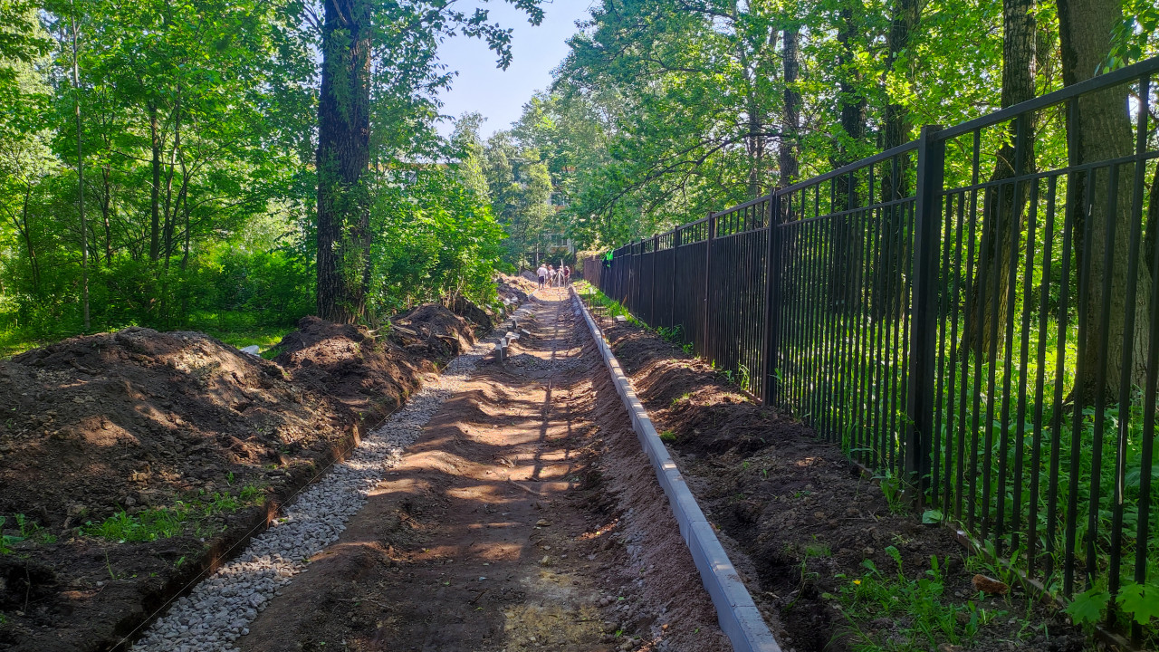 На снимке изображён участок формирования новой пешеходной дорожки в лесопарковой зоне. По краям траншеи уложены бордюрные камни, а по центру просматривается подготовка основания с участками щебня. Слева заметны насыпи грунта, справа тянется металлическое ограждение, за которым находится густая зелёная растительность. Вдали работают несколько человек, занятых ручными операциями. Снимок можно использовать в материалах о благоустройстве, городской среде и этапах создания пешеходных маршрутов.