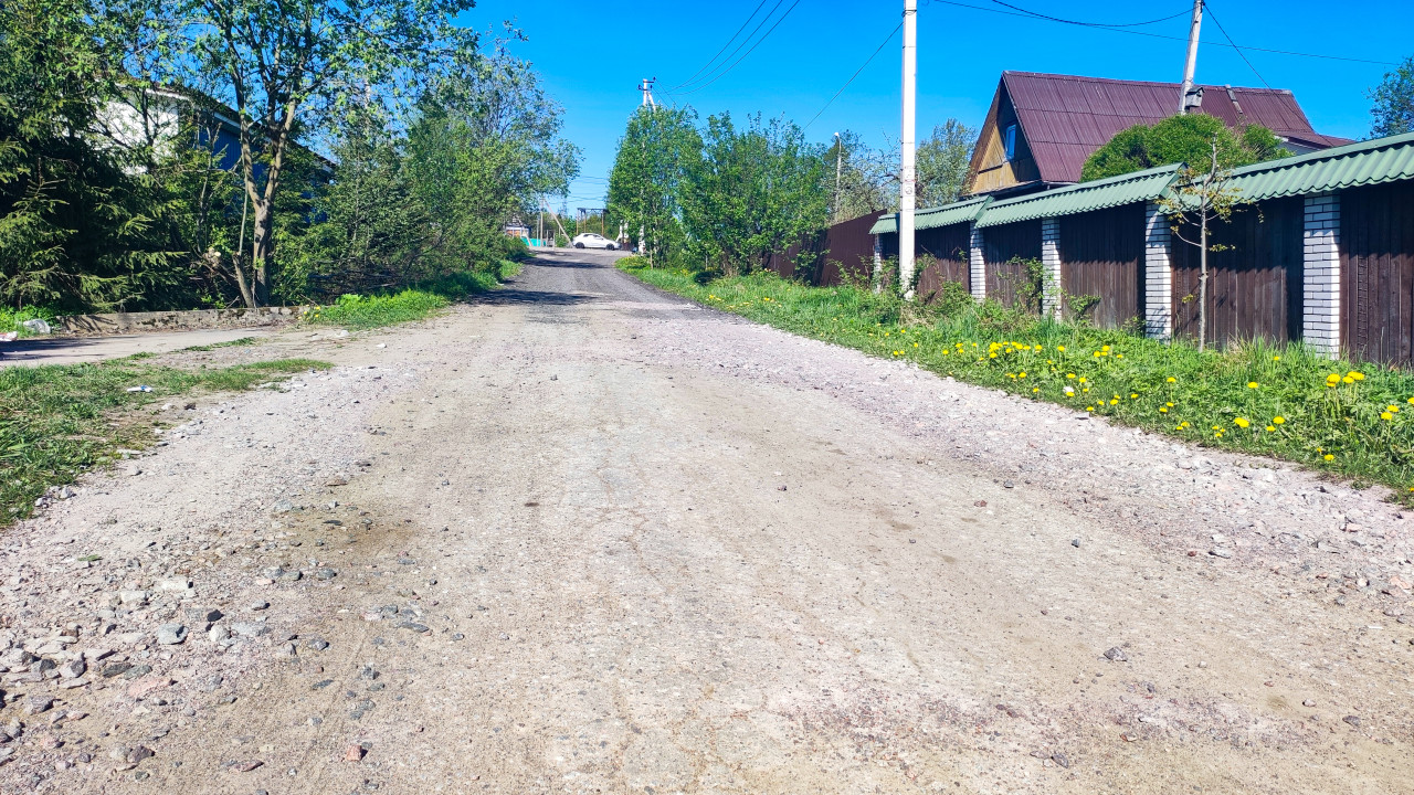 Просёлочная дорога с забором и жилыми строениями вдоль обочины