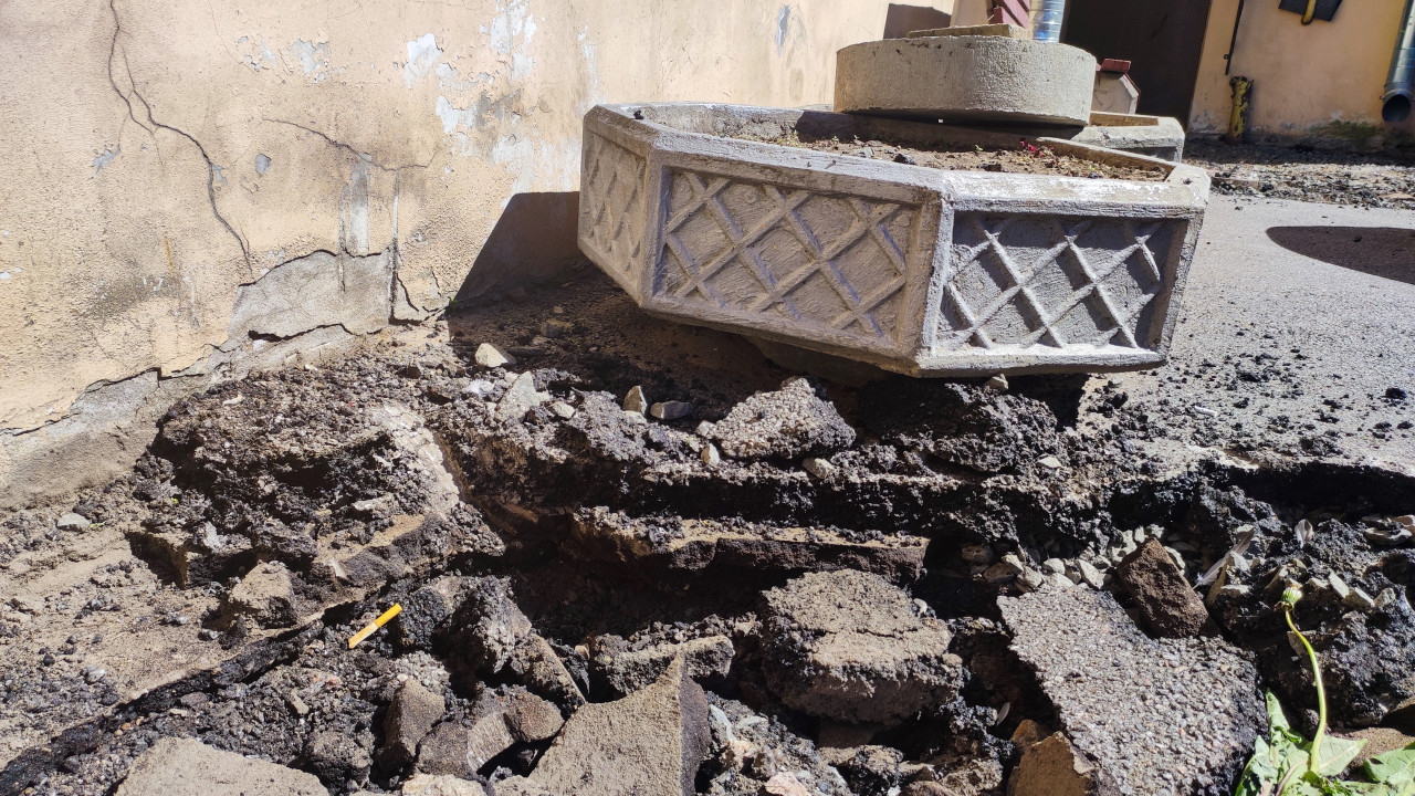 На фото изображён бетонный вазон с декоративными рельефными панелями, установленный рядом со стеной жилого здания. Под вазоном видны слои разрушённого асфальтового покрытия и оголённый грунт. Стена здания покрыта трещинами и следами старой штукатурки. В нижней части кадра заметен фрагмент растительности. Сцена снята днём при ярком солнечном освещении. Фотография подходит для материалов о ремонте дворовых территорий, состоянии городских покрытий и благоустройстве.