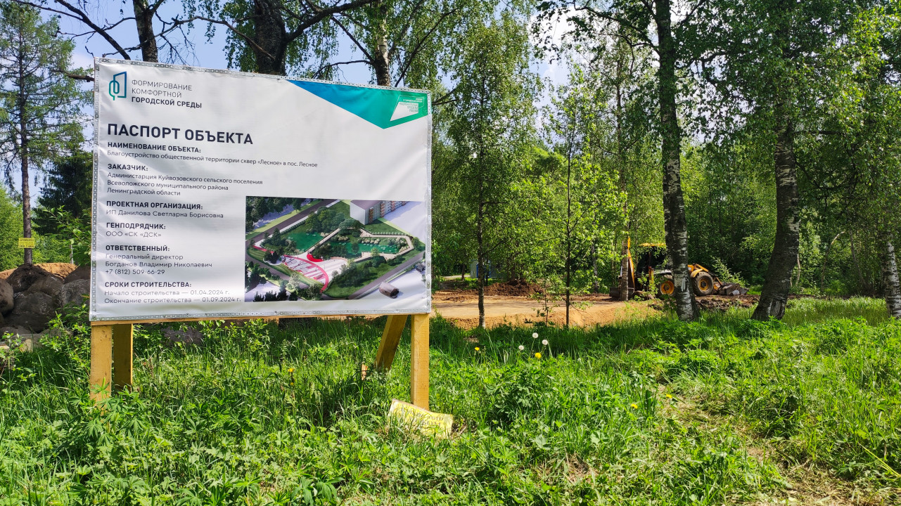 Информационный щит и начало работ по благоустройству сквера в посёлке Лесное