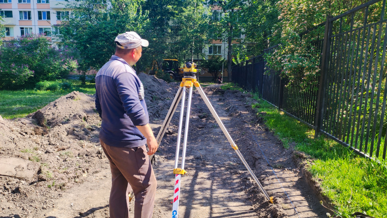 геодезист нивелир геодезия геодезическое оборудование строительная площадка разметка инженерные работы строительный контроль благоустройство технический надзор измерения траншея штатив рабочий грунт насыпи ограждение жилой район летний сезон подготовка дорожки контроль уровня строительные процессы городской двор проектирование строительные измерения территория работ инженерная подготовка объект благоустройстваПохожие фотографии