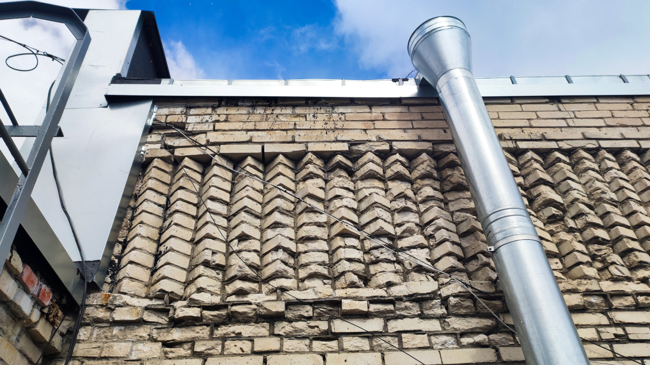 На фотографии показан фрагмент фасада промышленного здания, выполненного из светлой кирпичной кладки с выраженным рельефным узором. В верхней части виден металлический карниз и элементы кровельного примыкания. Справа расположена вентиляционная труба из оцинкованного металла, закрепленная на фасаде. Через стену проходят кабели, закреплённые вдоль декоративного ряда кирпичей. В кадре частично присутствует наружная металлическая конструкция. Сцена может использоваться для материалов о технических деталях промышленной архитектуры, состоянии фасадов и инженерных систем.