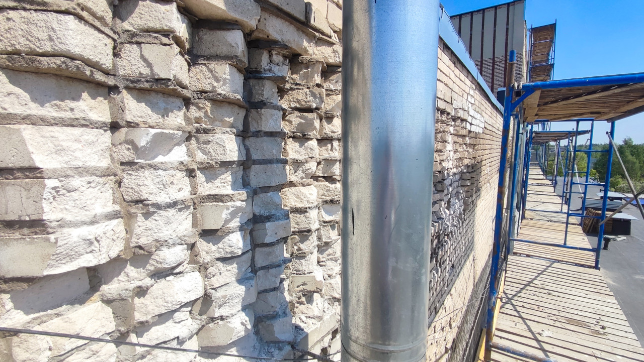 На фотографии представлен крупный фрагмент кирпичной стены, находящейся в процессе восстановления. В центре видны участки разрушенной кладки, где отдельные кирпичи утратили целостность и требуют замены или укрепления. Рядом расположена металлическая труба водосточной или вентиляционной системы. Справа заметна линия строительных лесов, установленных вдоль фасада. На заднем плане просматриваются элементы крыши и зелёные насаждения. Фотография подходит для публикаций о техническом состоянии зданий, работах по реконструкции и особенностях ремонта фасадов.