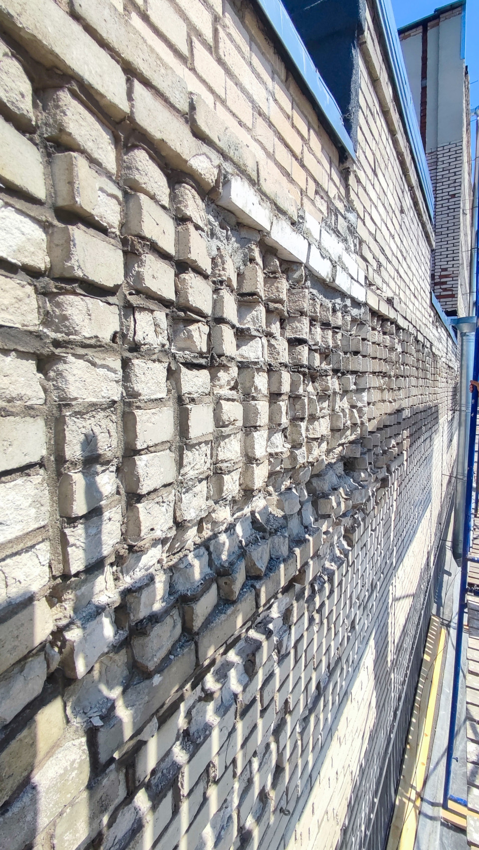 На изображении представлен протяжённый фрагмент фасадной стены, где заметна зона повреждённой кладки с выступающими и разрушенными кирпичами. В верхней части кадра виден ровный ряд, отделённый горизонтальным элементом, под которым располагается декоративная часть стены, частично утратившая форму. Слева и справа заметны строительные леса, используемые для выполнения восстановительных работ. Освещение подчёркивает неоднородность поверхности и объём разрушений. Фотография подходит для публикаций о дефектах фасадов, необходимости реконструкции, строительной экспертизе и отчётов о состоянии зданий.