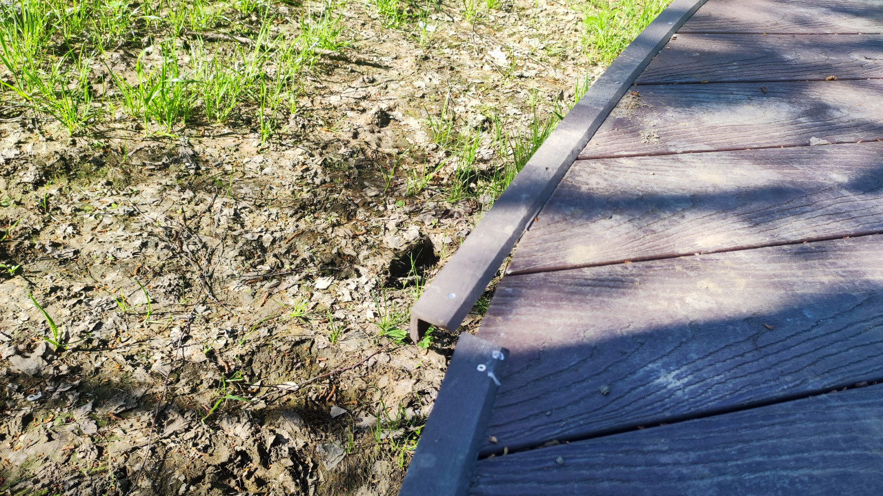 На фото показана кромка деревянного настила, выполненного из досок тёмного оттенка, на стыке с грунтовой поверхностью. Видно повреждение у края настила и выступающий уголок обрамляющей планки. На грунтовом участке заметны следы влажной почвы, молодая трава и растительный мусор. Кадр освещён естественным дневным светом. Снимок можно использовать для иллюстрации материалов о техническом состоянии настилов, осмотрах объектов благоустройства и проблемах эксплуатации уличной инфраструктуры.