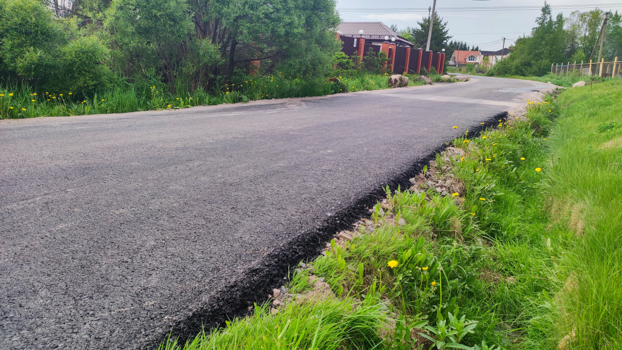 На изображении запечатлён участок сельской дороги с недавно уложенным асфальтом, образующим аккуратный край над обочиной. По обеим сторонам проезжей части растут кустарники, высокая трава и одуванчики. Вдали видны частные дома, заборы и линии электропередачи. Дорога проходит через загородный посёлок и окружена природным ландшафтом. Фотография подходит для материалов о дорожных работах, строительстве и ремонте покрытия, благоустройстве поселковых территорий и развитии транспортной инфраструктуры.