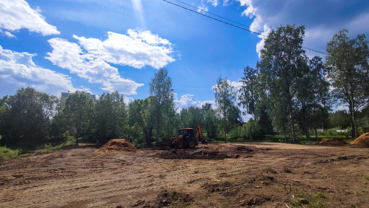На фото показана строительная площадка на границе лесного массива, где идёт активная работа экскаватора. На переднем плане заметны следы техники и рыхлый грунт, образующий ровную площадку. По краям территории лежат кучи песка и земли. На заднем плане видны берёзовые и другие лиственные деревья, а также фрагмент постройки. В небе располагаются плотные облака, освещённые солнцем. Снимок подходит для материалов о строительстве, земляных работах, подготовке участка, механизации, ландшафтных изменениях и освоении территории.