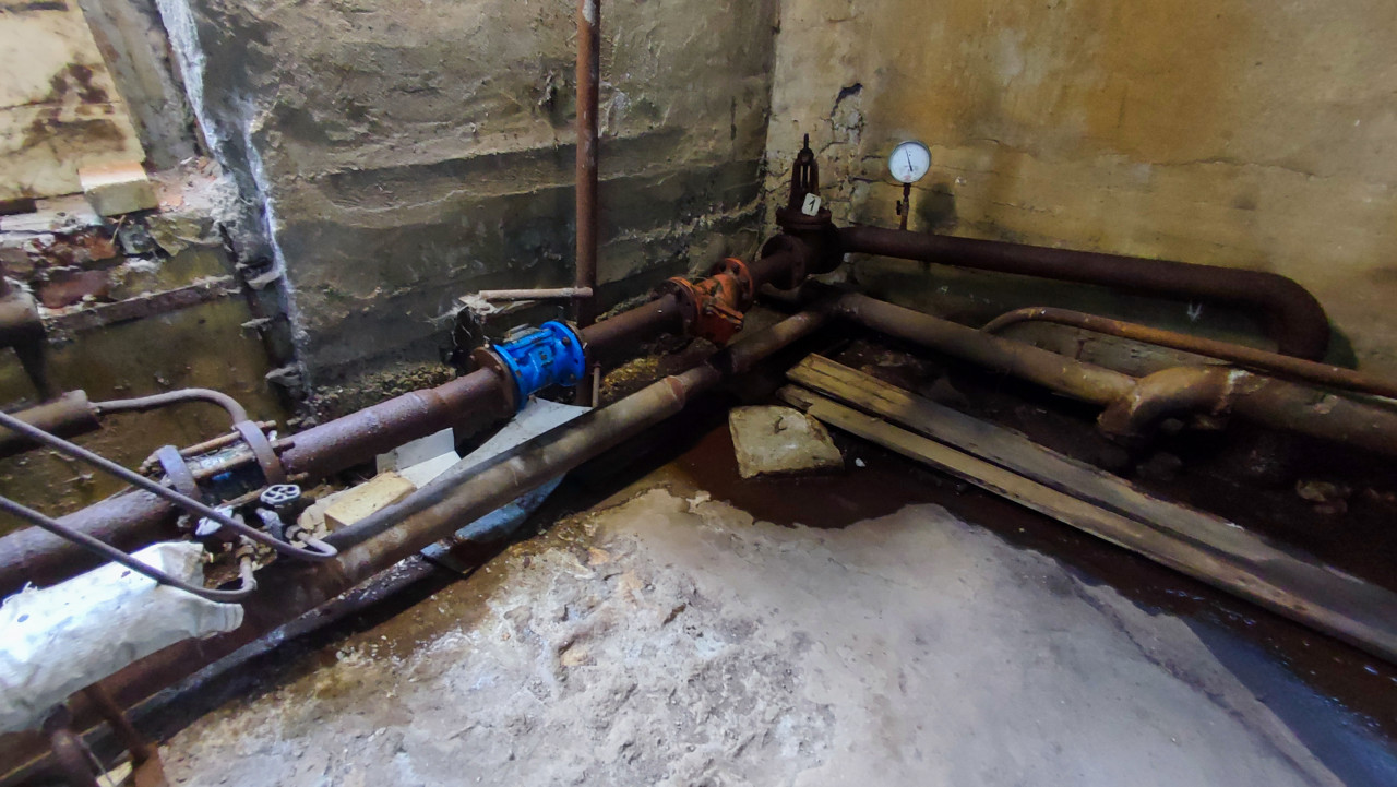 На фотографии запечатлён фрагмент подвального помещения со старыми тепловыми трубами и арматурой. Металлические трубы покрыты коррозией, на них расположены задвижки, одна из которых окрашена в синий цвет. Слева видны элементы старой теплоизоляции. На стене установлен манометр, показывающий давление в системе. На полу присутствуют следы влаги, ржавчины и строительный мусор. Состояние узла указывает на длительную эксплуатацию инженерных сетей. Снимок подходит для материалов о техническом обследовании, аварийных ситуациях и реконструкции коммунальной инфраструктуры.