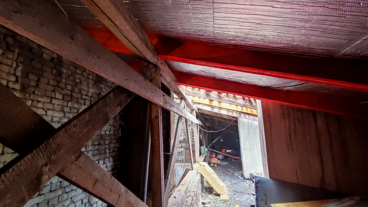На снимке видно чердачное пространство, где ведется установка новых деревянных элементов и укладка отражающего утеплителя над кирпичной стеной. Слева заметны старые балки и распорки, а на полу расположены строительные материалы и инструменты. Сквозь проход вглубь открывается перспектива разобранной части крыши. Кадр демонстрирует этап реконструкции, связанный с заменой элементов перекрытия и улучшением теплоизоляции. Фотография подходит для материалов о строительных работах, техническом надзоре или модернизации чердаков.