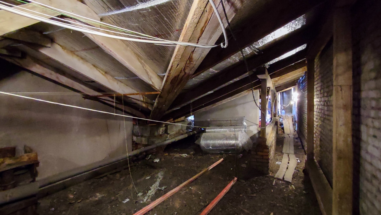 На фотографии изображено чердачное помещение, где заметны стропильные элементы, частично покрытые отражающим утеплителем, укрепленные распорки, вентиляционные каналы и инженерные трубы. На полу присутствуют следы строительных работ, обломки древесины и мусор. Справа проходит кирпичная стена, вдоль которой уложены временные деревянные настилы для перемещения. В глубине видно освещенный участок, где продолжаются работы. Снимок подходит для технических материалов о состоянии перекрытий, монтаже утеплителя и обслуживании инженерных систем.