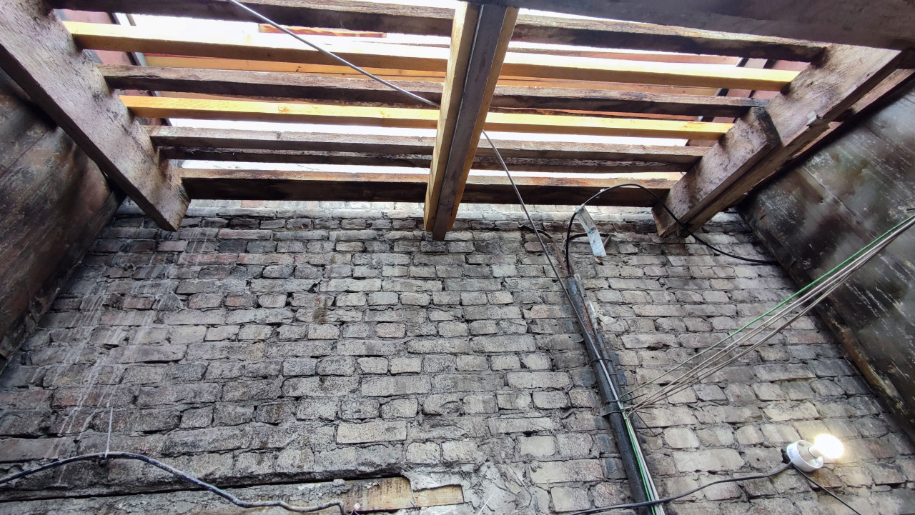 На фотографии виден участок чердака, где кровля временно разобрана, а деревянные балки перекрытия полностью открыты. Через проем поступает свет, освещая старую кирпичную стену с закрепленной электропроводкой. Деревянные элементы конструкции имеют следы износа и готовятся к замене. В нижней части кадра заметны обломки древесины и следы строительных работ. Сцена демонстрирует этап реконструкции кровли и может использоваться для материалов о демонтаже старых конструкций, ремонте перекрытий и анализе технического состояния зданий.
