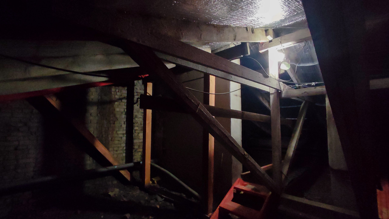 Темный чердачный пролёт с деревянными подпорками и временным освещением
