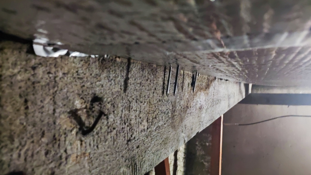 На фотографии крупным планом показана часть балки с неровной поверхностью и выступающими металлическими гвоздями. Над конструкцией закреплен отражающий утеплитель, края которого видны в верхней части кадра. Фон включает кирпичную стену и фрагменты инженерных коммуникаций. Снимок демонстрирует состояние отдельных элементов перекрытия и может применяться в материалах о строительной экспертизе, ремонте деревянных конструкций и анализе дефектов строительных элементов.