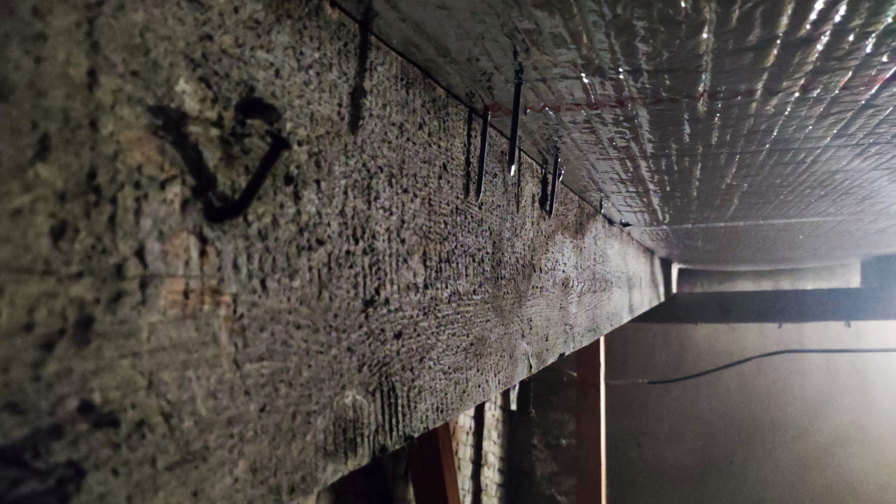 На фотографии крупным планом показан фрагмент старой деревянной балки, из которой выступают несколько металлических гвоздей различной длины. Над балкой закреплён отражающий утеплитель с характерной фактурой и стыками, уложенный под перекрытием. На заднем плане видны элементы кирпичной стены и тени от конструкций. Снимок фиксирует фрагмент незавершённых строительных работ и может использоваться для материалов о техническом состоянии деревянных перекрытий, вопросах безопасности, демонтаже и монтаже утеплительных систем.