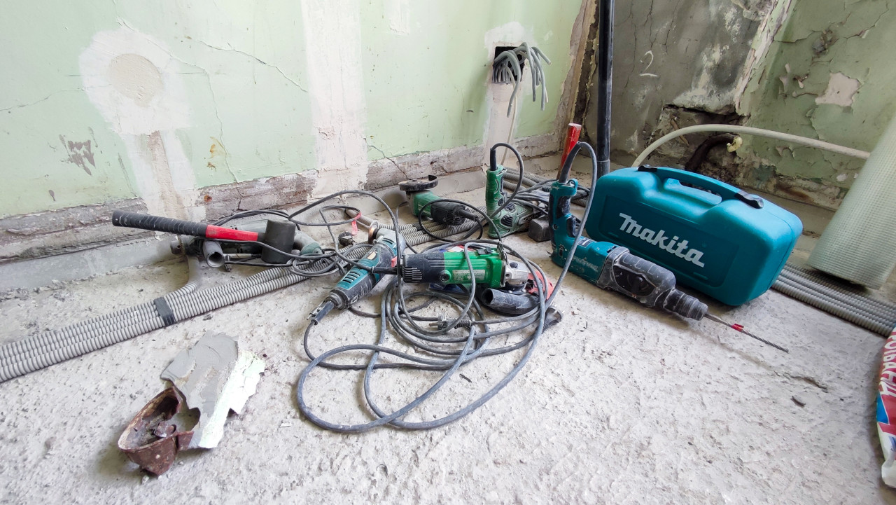 ремонт строительство электроинструмент перфоратор дрель болгарка шлифмашина makita проводка кабели гофротруба инструменты электроинструменты Makita подготовка стен гофротрубы инженерные сети демонтаж строительные работы рабочее место комната оборудование электротехника рабочий процесс строительный мусор подготовка помещения ремонт квартиры инструменты на полу монтаж электромонтажПохожие фотографии
