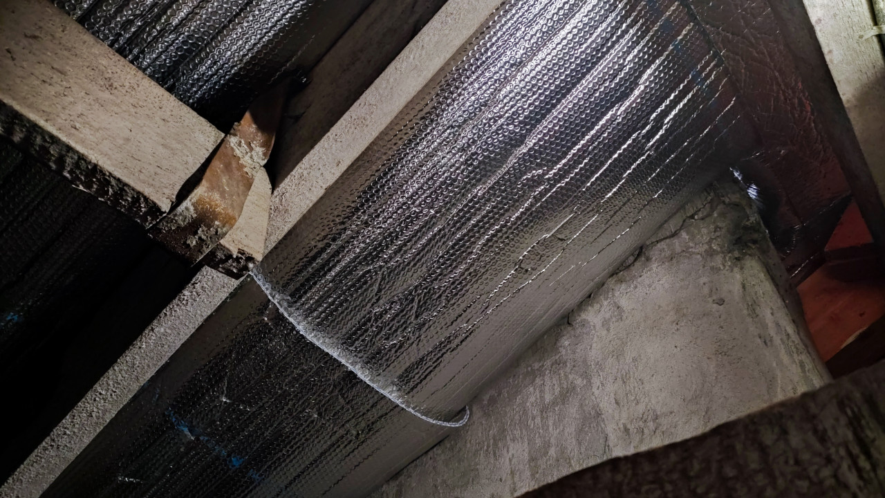 На фотографии изображен участок перекрытия, где отражающий утеплитель закреплен под стропильной системой. Видны деревянные балки разного состояния, подрезанные элементы конструкции и участки бетонной стены. На двух уровнях заметны места крепления утеплителя, а также провод, проходящий вдоль поверхности. Снимок используется для тем, связанных с утеплением кровли, внутренним монтажом, анализом состояния перекрытий и технических помещений.