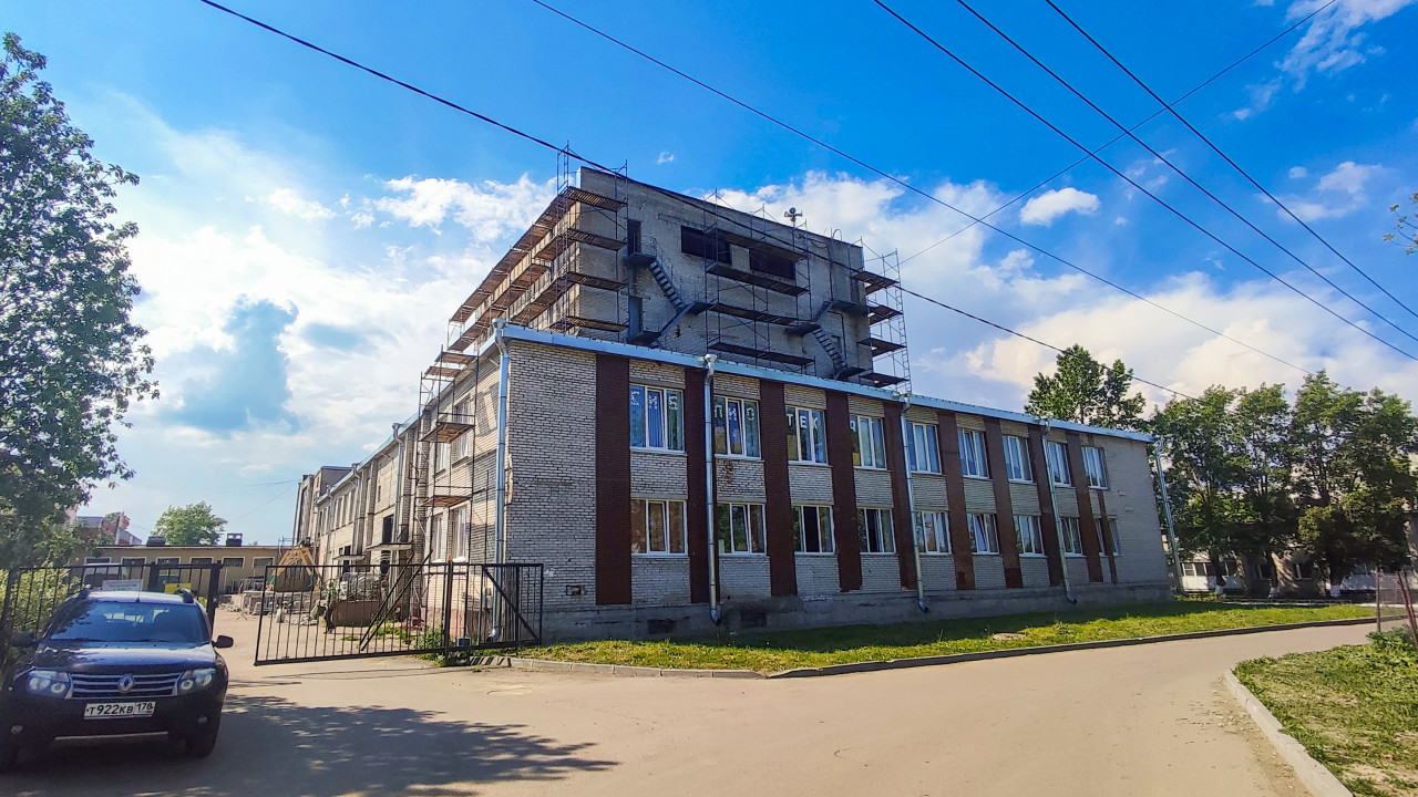 На изображении представлено здание промышленного или административного назначения советской постройки, выполненное из светлого кирпича. Верхняя часть сооружения окружена строительными лесами, что указывает на проведение ремонтных или восстановительных работ. На переднем плане видны ворота, автомобиль и часть внутреннего двора. На фоне — деревья и ясное небо. Здание имеет характерный для второй половины XX века архитектурный облик. Фото пригодно для материалов о реконструкции зданий, городской среде, техническом состоянии объектов и промышленной архитектуре.