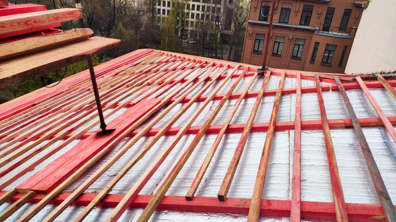 На фотографии показан фрагмент монтажа обрешётки кровли, где на поверхности закреплен слой отражающего утеплителя. Деревянные рейки и бруски расположены частыми рядами, а в левой части кадра видна временная монтажная площадка. На фоне — верхние части фасада соседнего здания и кроны деревьев. Снимок можно использовать в темах, связанных с ремонтом крыш, внешней реконструкцией и устройством теплоизоляции.