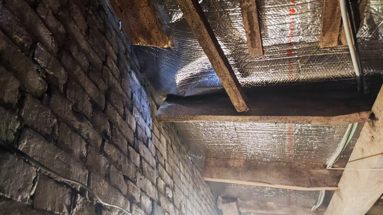 Кирпичная стена и балки под отражающим утеплителем