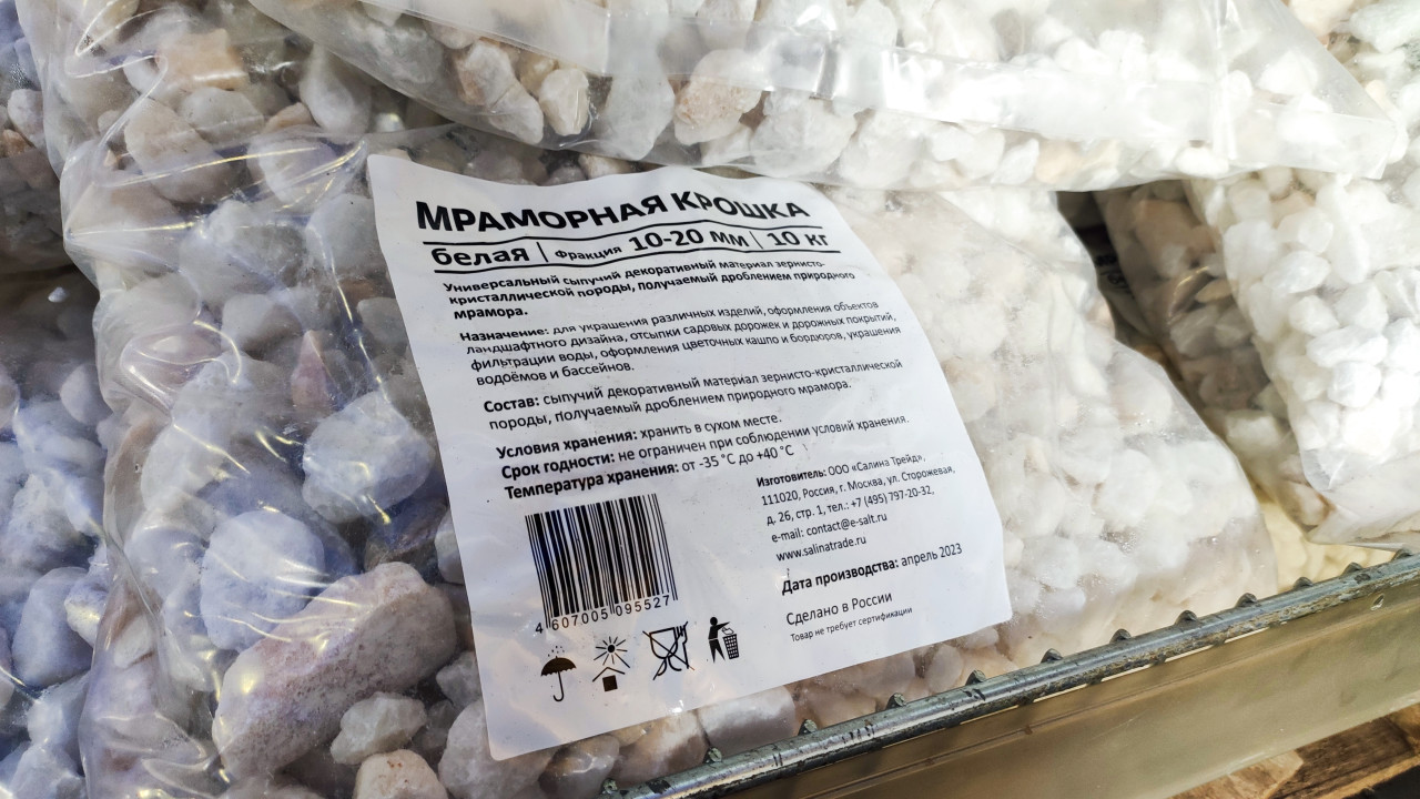 Упаковка белой мраморной крошки фракции 10–20 мм в магазине