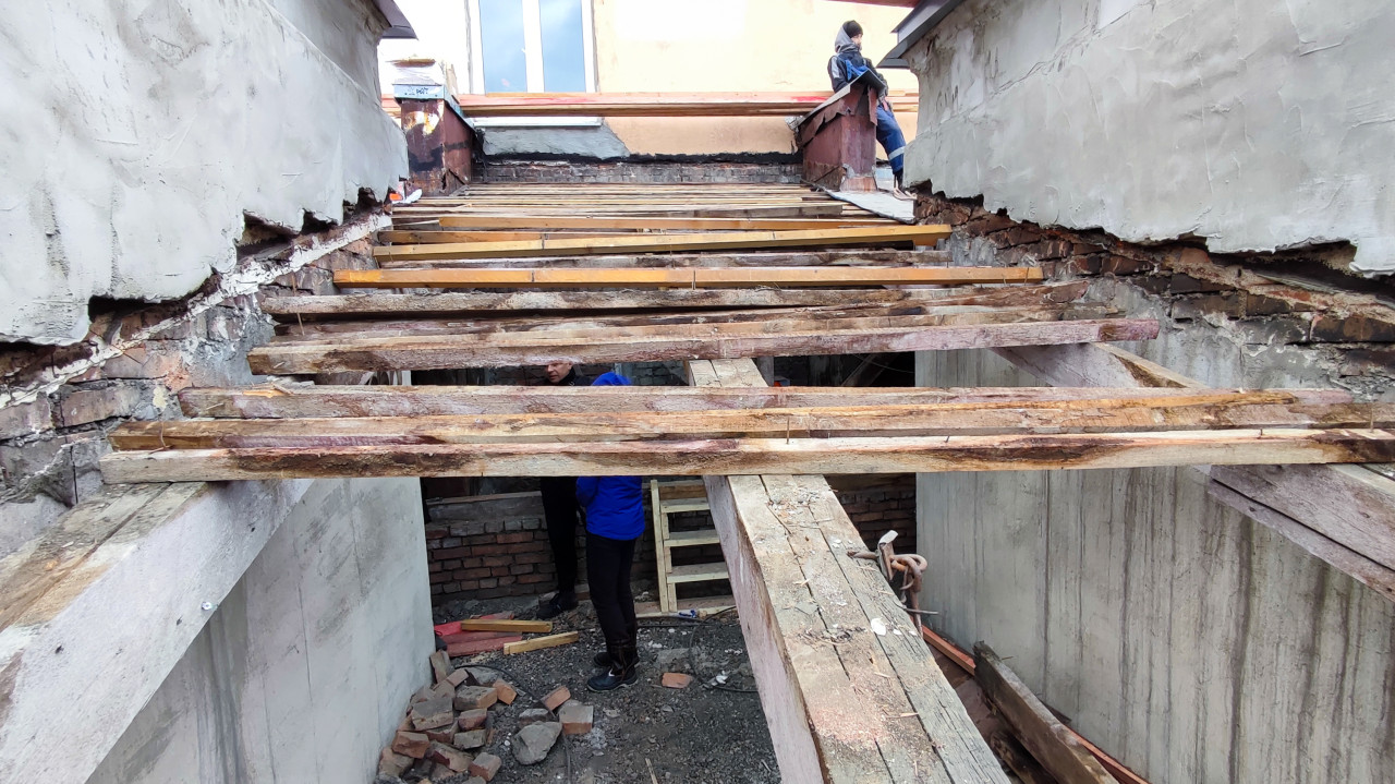 На фотографии показан процесс демонтажа деревянного перекрытия на верхнем уровне жилого дома в Санкт-Петербурге. В кадре видны оголенные балки, уложенные поперек пространства, следы разрушенной кирпичной кладки и штукатурки на стенах. Между балками образовано пустое пространство, под которым находится помещение с бетонными стенами. На площадке работают двое людей, один из которых стоит на нижнем уровне. Снимок может быть использован в материалах о реконструкции старых зданий, обследовании несущих конструкций и демонтажных работах в условиях городской застройки.