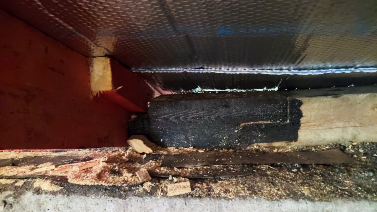 На снимке запечатлен фрагмент кровельного пространства жилого дома в Санкт-Петербурге, где ведутся работы по утеплению. Видны листы фольгированного теплоизоляционного материала, деревянные элементы конструкции и частично обугленный фрагмент балки. На поверхности заметны следы древесной стружки и мусора, характерные для ремонтных работ. Фото может быть использовано в статьях о монтаже теплоизоляции, ремонте деревянных кровель и особенностях обновления старых домов городской застройки.