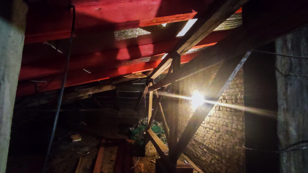 Снимок демонстрирует чердачное пространство с деревянными стропилами, временными подпорками и открытой кирпичной стеной. На потолке закреплены листы утеплителя, а вдоль пола лежат строительные материалы, обрезки древесины и упаковки. Яркая лампа освещает часть помещения, создавая контраст между светом и тенями. Видны элементы старой кровли и инженерные коммуникации. Фотография подойдёт для иллюстрации ремонта и обследования чердаков, демонстрации конструктивных особенностей старых зданий.