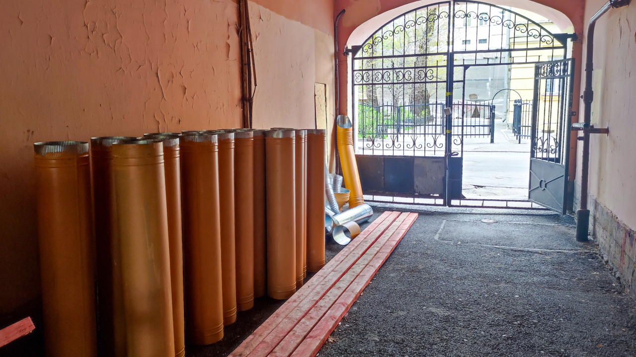 На снимке под аркой проходного двора в Санкт-Петербурге размещены строительные материалы. Слева выстроен ряд жёлтых металлических труб, стоящих вертикально вдоль стены. Рядом уложены длинные красные деревянные доски, а ближе к выходу к улице видны металлические элементы воздуховодов и отдельные секции труб. Арка окрашена в пастельный тон, на стенах заметны следы износа штукатурки. Через открытую кованую створку ворот видна часть дворовой территории и улицы. Фотография подходит для тем, связанных со строительством, благоустройством дворов и организацией ремонтных зон в жилых кварталах Санкт-Петербурга.