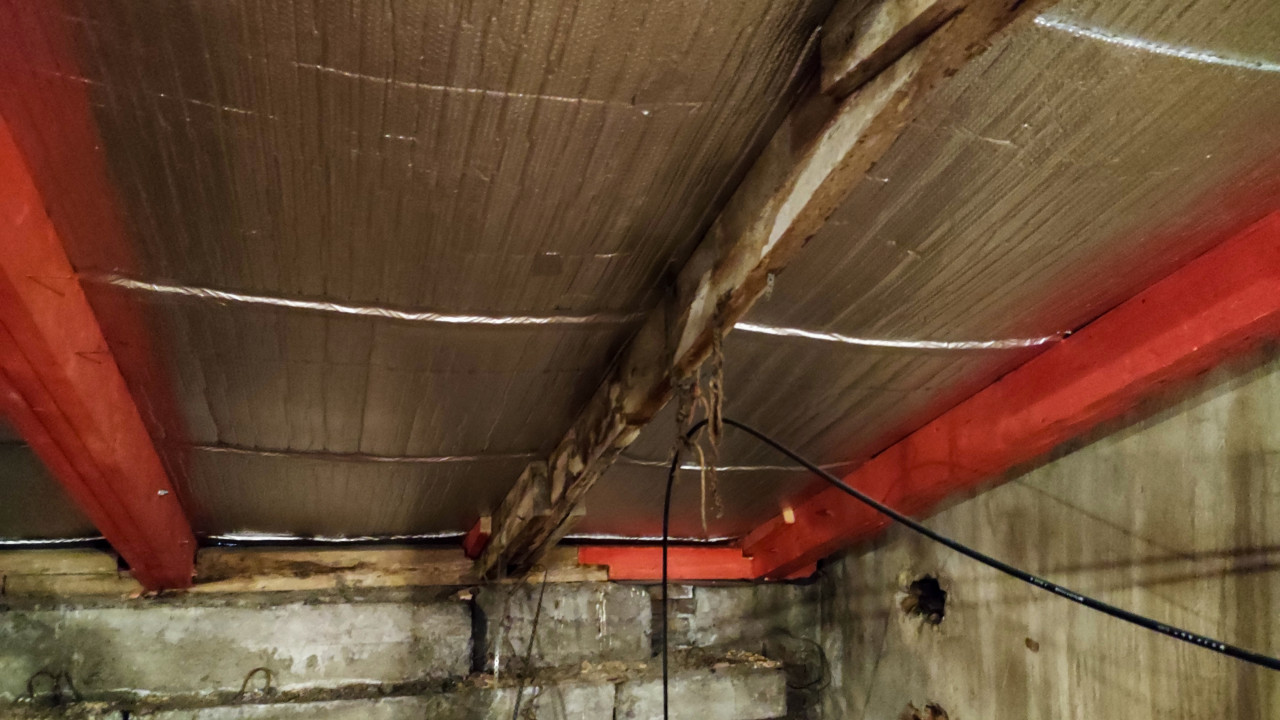 На снимке показан фрагмент чердачного пространства жилого здания в Санкт-Петербурге, где крупным планом виден опорный узел стропильной системы. Старые деревянные балки с выраженными следами износа опираются на бетонный элемент, под который подложены новые деревянные прокладки красного цвета. На потолке закреплена отражающая теплоизоляция. На полу заметны строительный мусор и обрывки кабелей. Фото может использоваться для демонстрации состояния чердаков, обследования конструкций и процессов ремонтно-восстановительных работ.