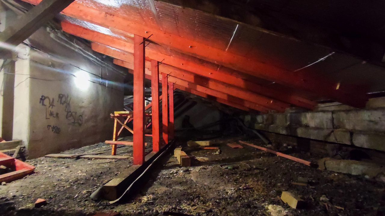 Фотография фиксирует участок чердака жилого здания в Санкт-Петербурге, где установлены деревянные временные опоры, обеспечивающие устойчивость стропильной системы при ремонте. На переднем плане видна самодельная лестница, ведущая к верхнему уровню прохода. Над пространством размещена теплоизоляция, а вдоль стен проходят электрические кабели. Помещение частично освещено монтажными светильниками. Снимок подходит для материалов о реставрации, техническом обслуживании и укреплении конструкций старых домов.