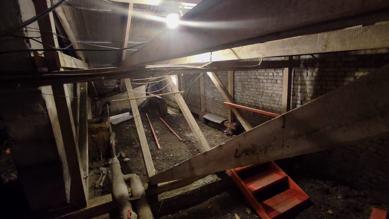 На изображении виден длинный проход вдоль чердачного пространства здания в Санкт-Петербурге. С обеих сторон располагаются деревянные подкосы и балки, поддерживающие наклонную конструкцию кровли. Внизу проходит система утеплённых инженерных труб, местами повреждённых. Освещение исходит от лампы, закреплённой над центральной частью кадра. На полу заметны строительный мусор, фрагменты досок и следы грунта. На заднем плане угадывается кирпичная кладка. Фото подходит для материалов о техническом обследовании и ремонте чердачных конструкций.