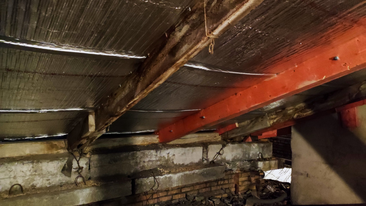 Фотография фиксирует наклонные балки чердачного перекрытия старого здания в Санкт-Петербурге, включая деревянные и металлические элементы, усиленные красными брусьями. Под балками расположена бетонная перемычка и кирпичная кладка, сохранившая следы износа. Потолок покрыт отражающим теплоизоляционным материалом. На некоторых участках видна коррозия креплений и следы протечек, а вдоль стены проходят кабели. Съёмка подходит для материалов о технических обследованиях, реконструкции и анализе состояния чердачных конструкций.