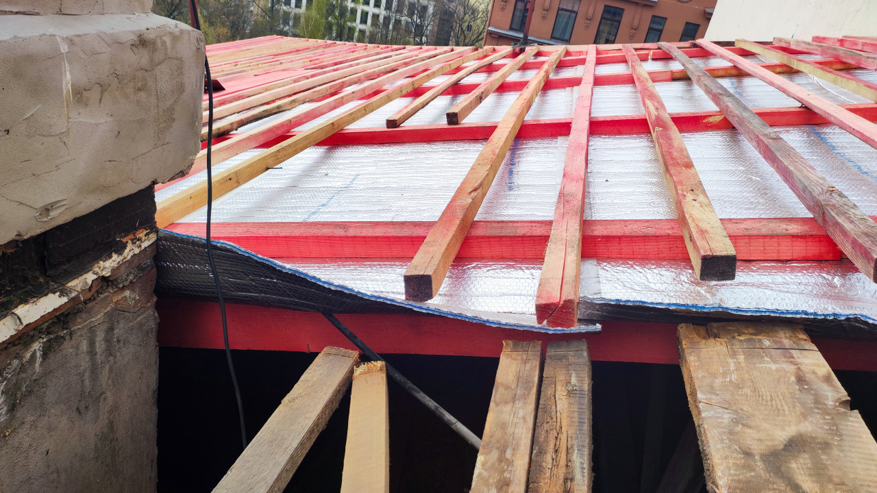 На фото изображён участок кровли, где деревянная обрешётка смонтирована над открытым проёмом между перекрытиями. Видны продольные и поперечные бруски, уложенные поверх слоя фольгированного утеплителя. Слева заметна часть кирпично-штукатурного элемента, а на переднем плане — открытое пространство между балками. Снимок фиксирует промежуточный этап работ по восстановлению кровельной конструкции и подходит для тематических строительных материалов.