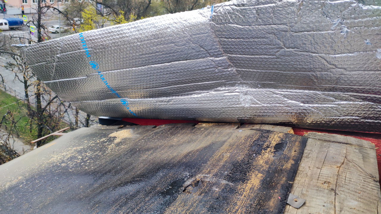 На снимке показан крупный лист фольгированного утеплителя, уложенный на поверхность старой кровли в Санкт-Петербурге. Под ним видны потемневшие доски обрешётки, частично повреждённые временем и воздействием влаги. На заднем плане присутствуют ветви деревьев и элементы уличной инфраструктуры. Фото отражает процесс подготовки крыши к дальнейшему ремонту или замене покрытия и может быть использовано в материалах о строительных технологиях, модернизации старых домов и сезонных работах по обслуживанию кровли.