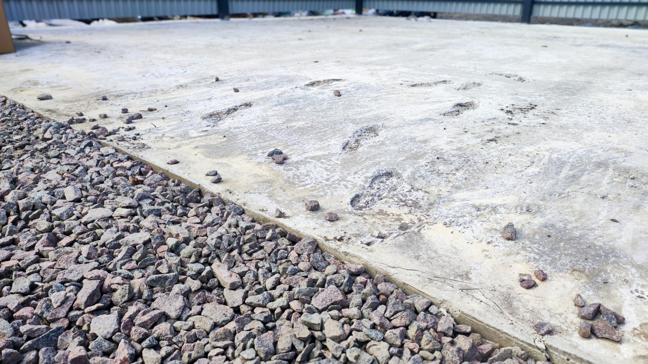 На фотографии запечатлён участок, где гравийное покрытие прилегает к бетонной плите, на которой видны следы обуви и отдельные камни. На заднем плане расплывчато видны элементы ограждения и строительные материалы. Фокус сделан на текстуре обоих типов покрытия и границе между ними. Естественное освещение подчёркивает неровности и контраст поверхностей. Кадр можно использовать для статей о строительстве, ремонте площадок и особенностях дорожных покрытий.